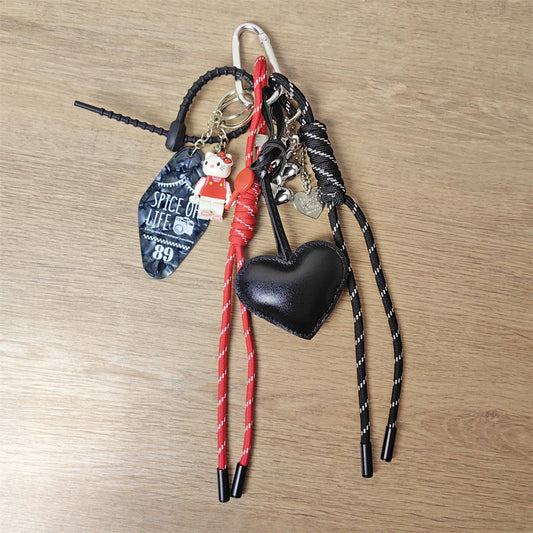 Adorable KT Cat Puzzle Keychain with Hotel Nameplate & Black Leather Heart Bag Charm for Girls